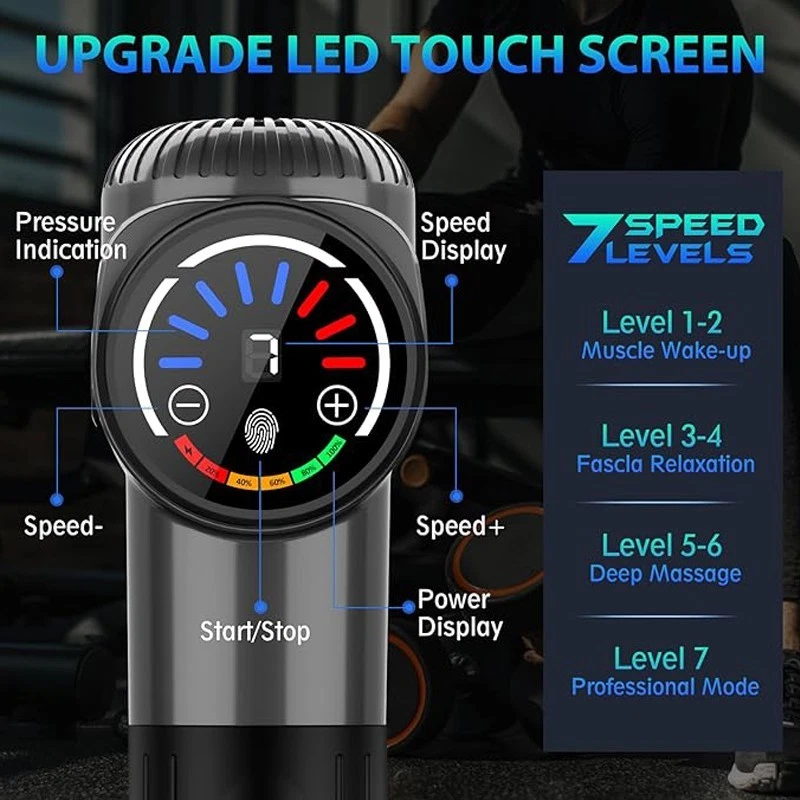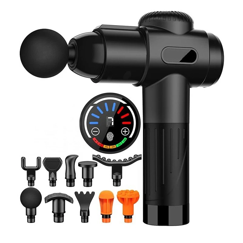 Aparat de masaj muscular tip pistol cu 10 capete interschimbabile, 7 niveluri de viteză și ecran LCD. Ideal pentru relaxare, detensionare și recuperare musculară după efort.